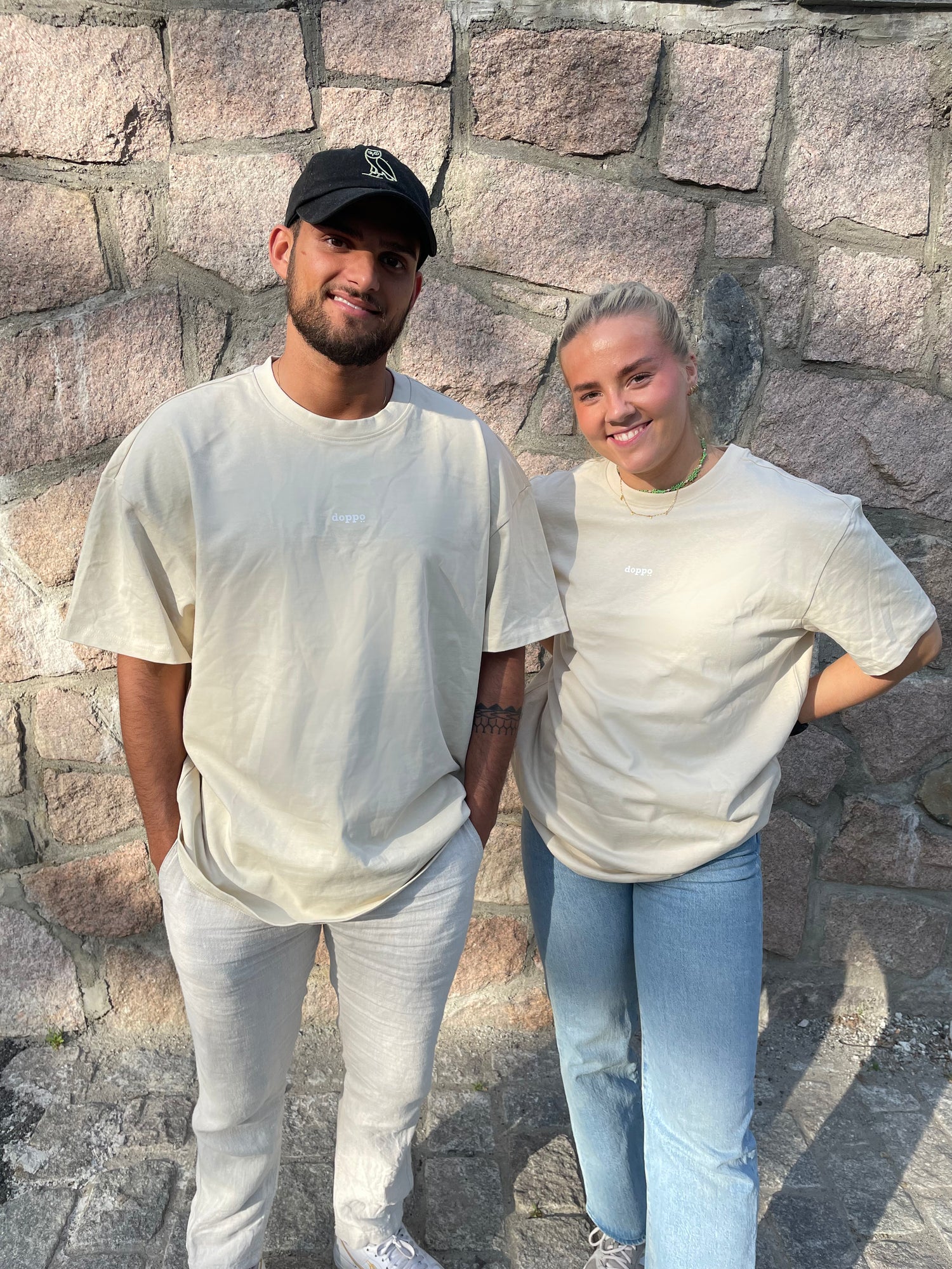 Bakgrunnen for Doppo er faktisk denne t-skjorten. Etter å ha trent styrke i mange år med polyester og annet syntetisk materiale ville vi prøve noe nytt. Vi ønsket oss noe som så litt bedre ut og var mer komfortabelt, og endte opp med å lage en hybrid t-skjorte! En blanding av det tykkere stoffet tencel som passer til aktivitet og hverdagsmaterialet bomull.